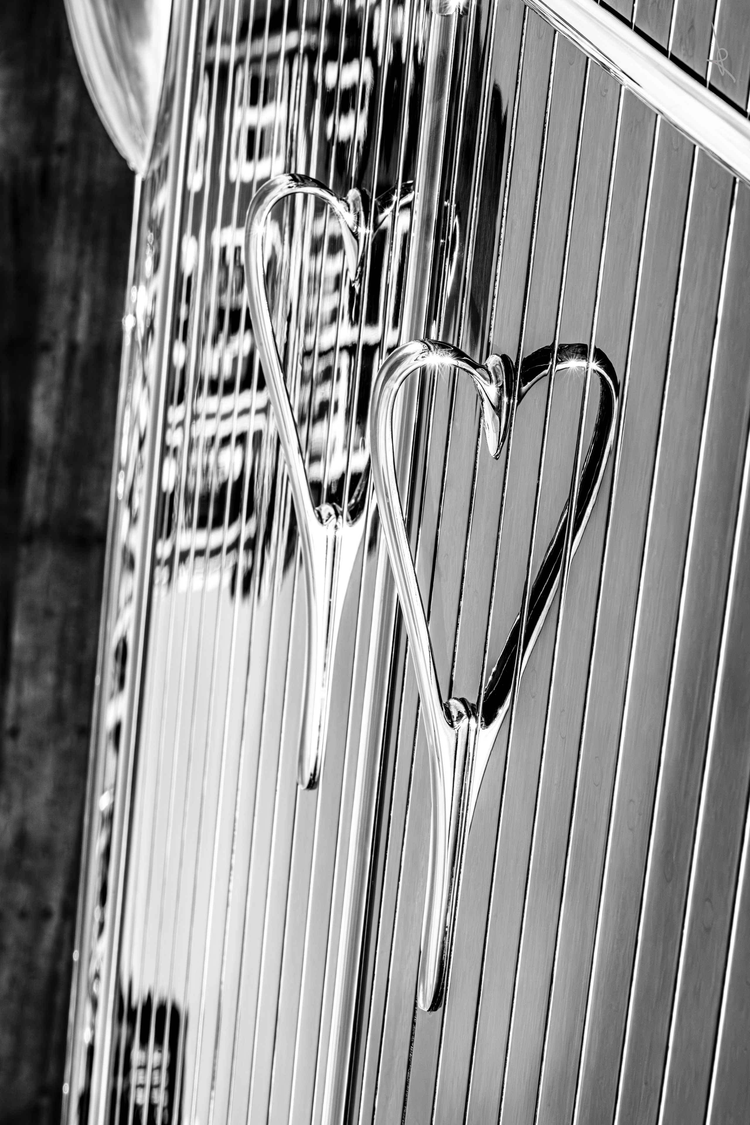 In this tightly framed monochrome, Alexander Kippe isolates the gleam of vintage marine brightwork until it reads as sculpture. Two polished fittings arc into unmistakably heart-shaped silhouettes, hovering over a field of disciplined mahogany lines. The camera’s oblique angle sets the composition on a graceful diagonal, allowing vertical ribbing to become rhythm—bars of light and shadow that pulse like a visual heartbeat. Reflections ripple through the chrome, distilling surrounding architecture into abstract pattern while preserving the tactile pleasure of hand-finished metal and wood. The result is a study in restraint and desire: spare geometry softened by curvature; industrial precision warmed by craft. The heart motif is not sentimental but engineered—the accidental valentine that appears when light, line, and immaculate fabrication converge. Kippe’s photograph speaks to collectors who appreciate design as much as subject, turning a classic runabout’s hardware into a contemporary object of contemplation. Installed large, the piece rewards close looking with layered reflections and micro-textures, yet from a distance it reads as a confident, modern graphic. It is a quiet celebration of devotion—to boats, to making, and to the luminous moments water culture offers the patient eye.