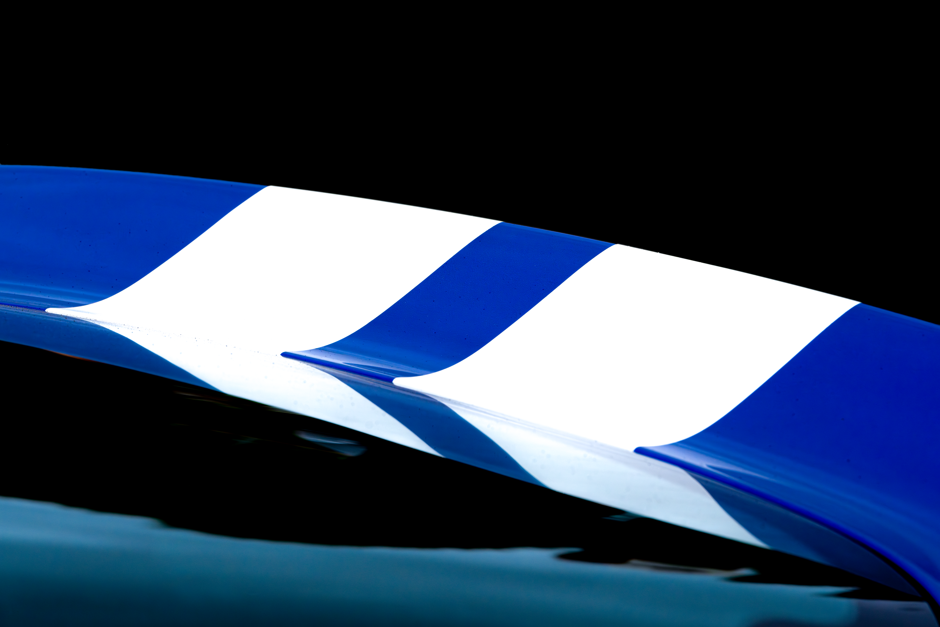 In this compelling artwork, the meticulous abstraction of classic automotive design is captured through graceful curves and vibrant contrasts. The polished blue and white racing stripe elegantly dances along the sleek contours of the vehicle, reflecting light to emphasize the purity of form and beauty inherent in mechanical craftsmanship. This minimalist composition transforms automotive detail into a timeless visual poetry, celebrating both the nostalgia and contemporary elegance of automotive artistry.